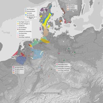 Hauslandschaft der Römischen Kaiserzeit (Verbreitungskarte mit Traditionsräumen); Auftraggeber: Institut für Prähistorische Archäologie, Freie Universität Berlin; Bearbeitung: Dr. A. Karlsen, 2014