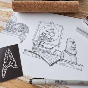 Das archäologische Vintage Poster lädt ein, einen Blick auf die Sammlung eines Archäologen zu Beginn des 20. Jahrhunderts zu werfen. In dieser Kunstkammer wurden Originale und Repliken der bekanntesten Funde der Menschheit zusammengestellt. Neben zahlreichen Büchern, Karten und Aufzeichnungen gibt es insgesamt über 40 faszinierende prähistorische Objekte zu entdecken, darunter ein Steinzeitmesser, eine ägyptische Katzenmumie, ein Vendelhelm, skandinavische Felsbilder, römische und griechische Tempel, ein Wikingerschiff sowie zahlreiche Gefäße und Schmuckobjekte.